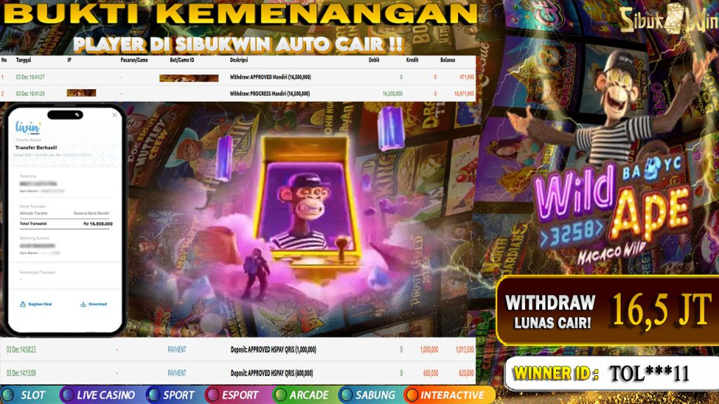 BUKTI KEMENANGAN 03 Desember 2025 DI GAME Wild Ape #3258 16,5 JUTA