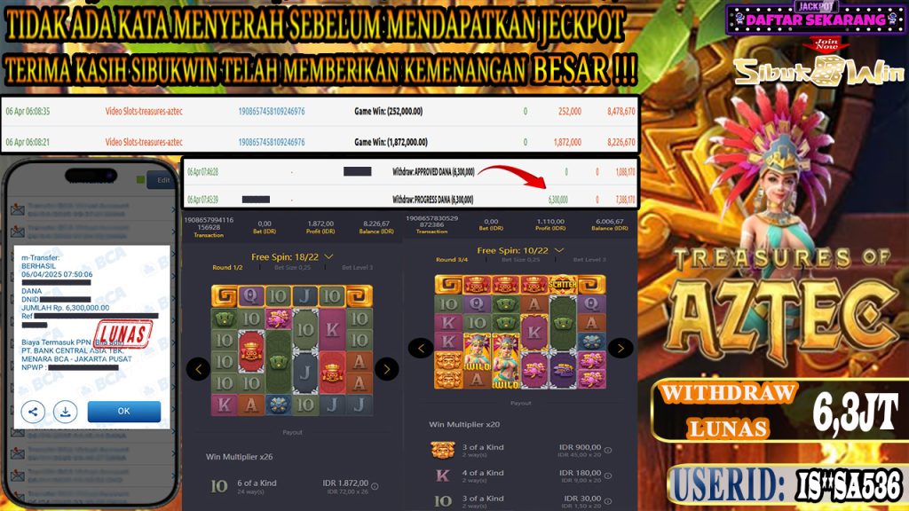 Bukti Kemenangan 06 April 2025 Di Treasures of Aztec WD 6,3 Juta