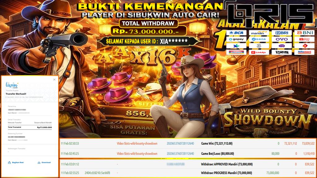 BUKTI KEMENANGAN 11 FEBRUARY DI GAME WILD BOUNTY SHOWDOWN WITHDRAW RP 73.000.000.-
