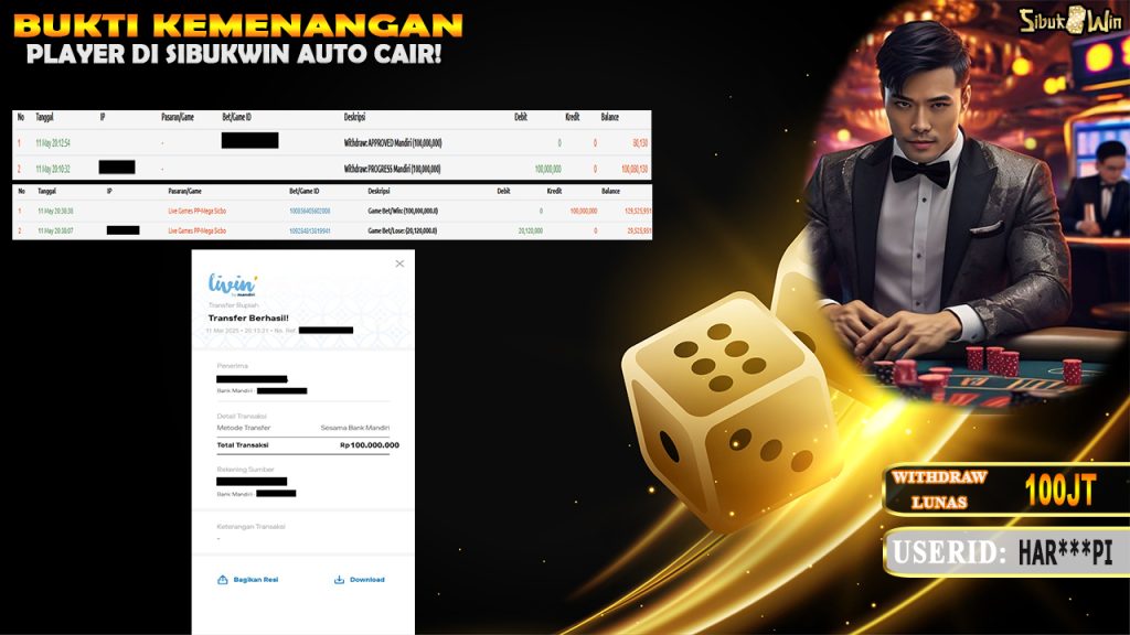 Bukti Kemenangan 11 Mei 2025 Di Game Live Casino Mega Sicbo WD 100 Juta