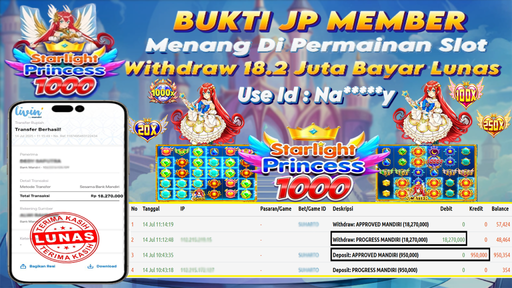 Bukti Kemenangan 14 Juli 2025 Di Game Starlight Princess 1000 WD 18.2 Juta