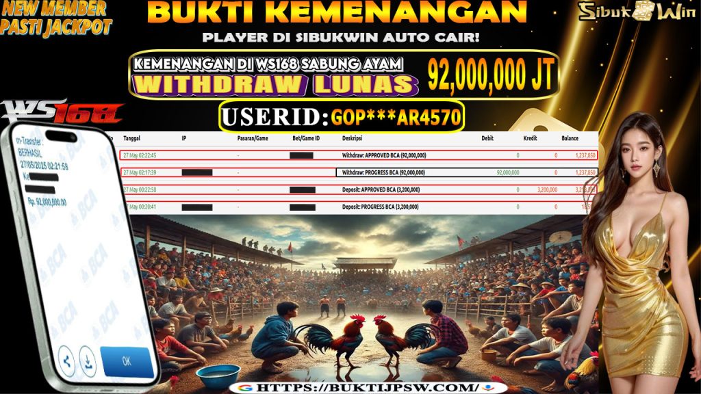 Bukti Kemenangan 27 MEI 2025 Di WS168 SABUNG AYAM WD 92 Juta