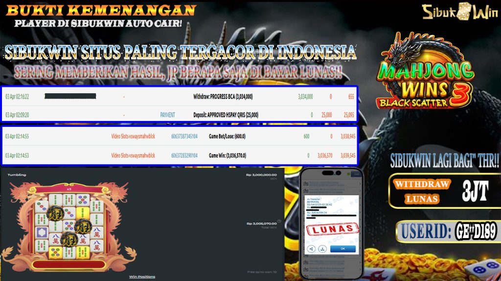 Bukti Kemenangan 3 April 2025 Di Game Mahjong Wins 3 – Black Scatter WD 3 Juta