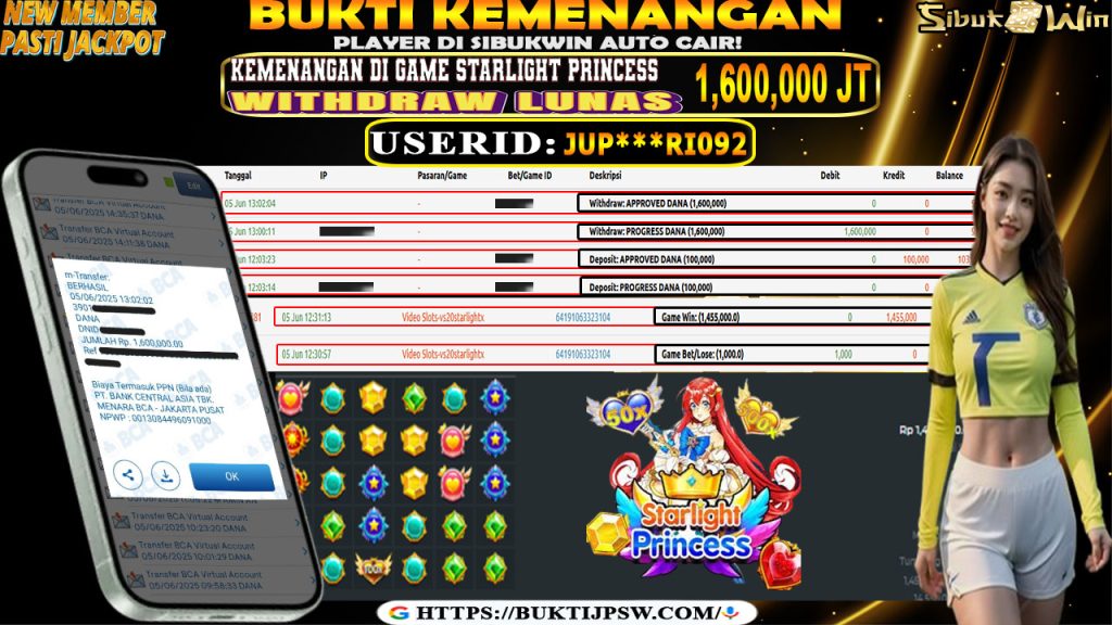 Bukti Kemenangan 5 JUNI 2025 Di GAME Starlight Princess WD 1,6 Juta